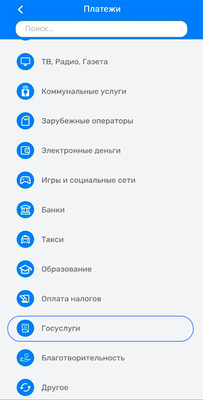 2.Выберите раздел «Госуслуги»